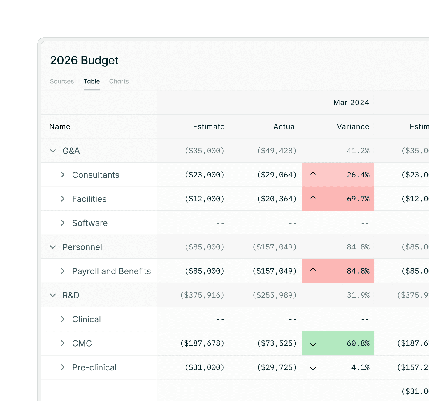 Analyze estimated vs. actual spend across R&D, G&A, Ops, and Personnel budgets